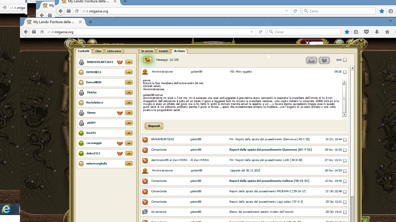 SALVE a tutti apro questo mio topic solo perchè volevo dare 1 punto in positivo all'aministrazione del gioco...pare che qualcosa si sta incominciando a muoversi ..nel senzo che tanti in tanti ho sentito lamentare del server italiano...ma come posso testimoniare io stesso l' aministrazione invece cerca di venirci incontro anche perchè lo sanno anche loro che nel gioco di my lands ci sono alcuni player che anno problemi col gioco cioè che laggano...vi racconto cosa mi è successo ieri stavo cambiando la maschera dell'orrore con il cappellino dell'esloratore x maledire un mio antagonista che non faccio il nome x serietà...è tutto ad un tratto mentre stavo facendo questo passaggio... bummmm...un bel colpo di lag è tutto impallato è bloccato allora che faccio chiudo il gioco è lo riavvio è vedo la mashera dell'orrore venduta ...mi ero disperato ma mi è bastato rivolgermi all'aministrazione in maniera coordiale è oggi ho avuto la risposta..che ora vi allego...fatto sta che la maschera dell'orrore me l'anno restituita in meno di 24 ore...